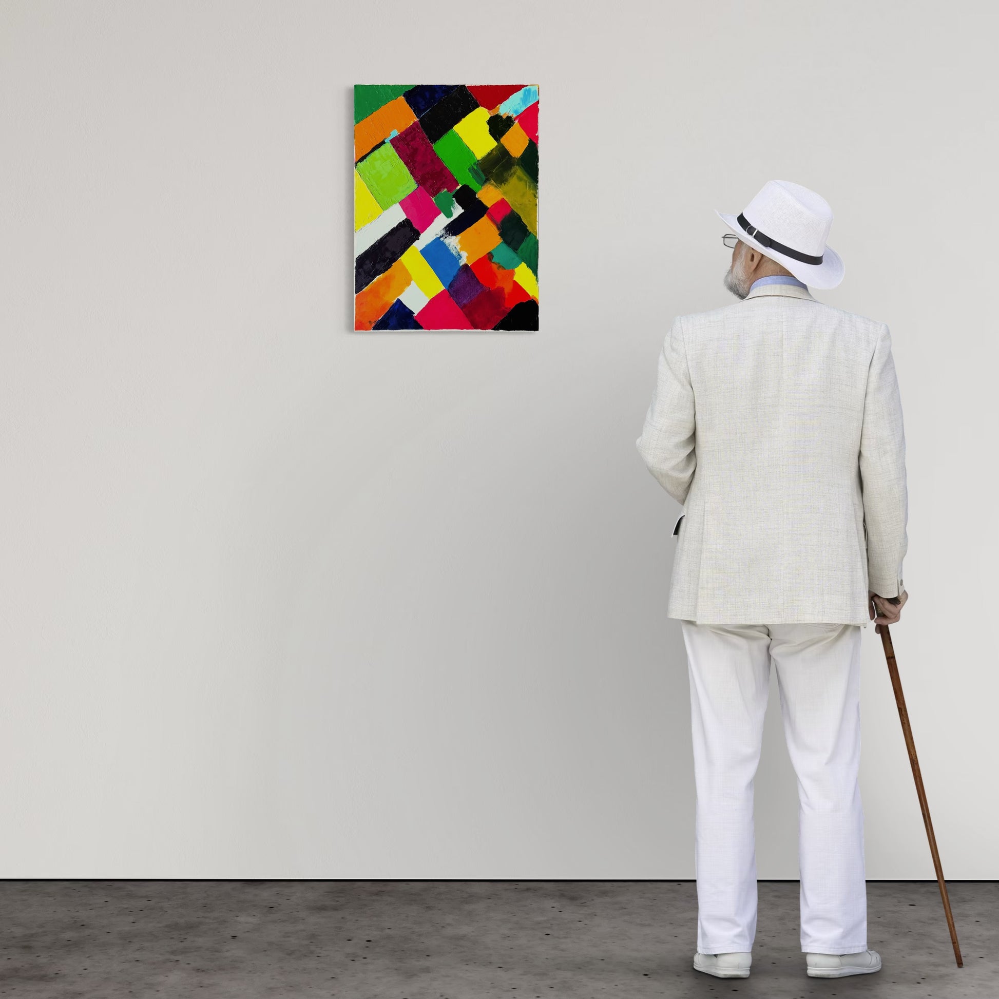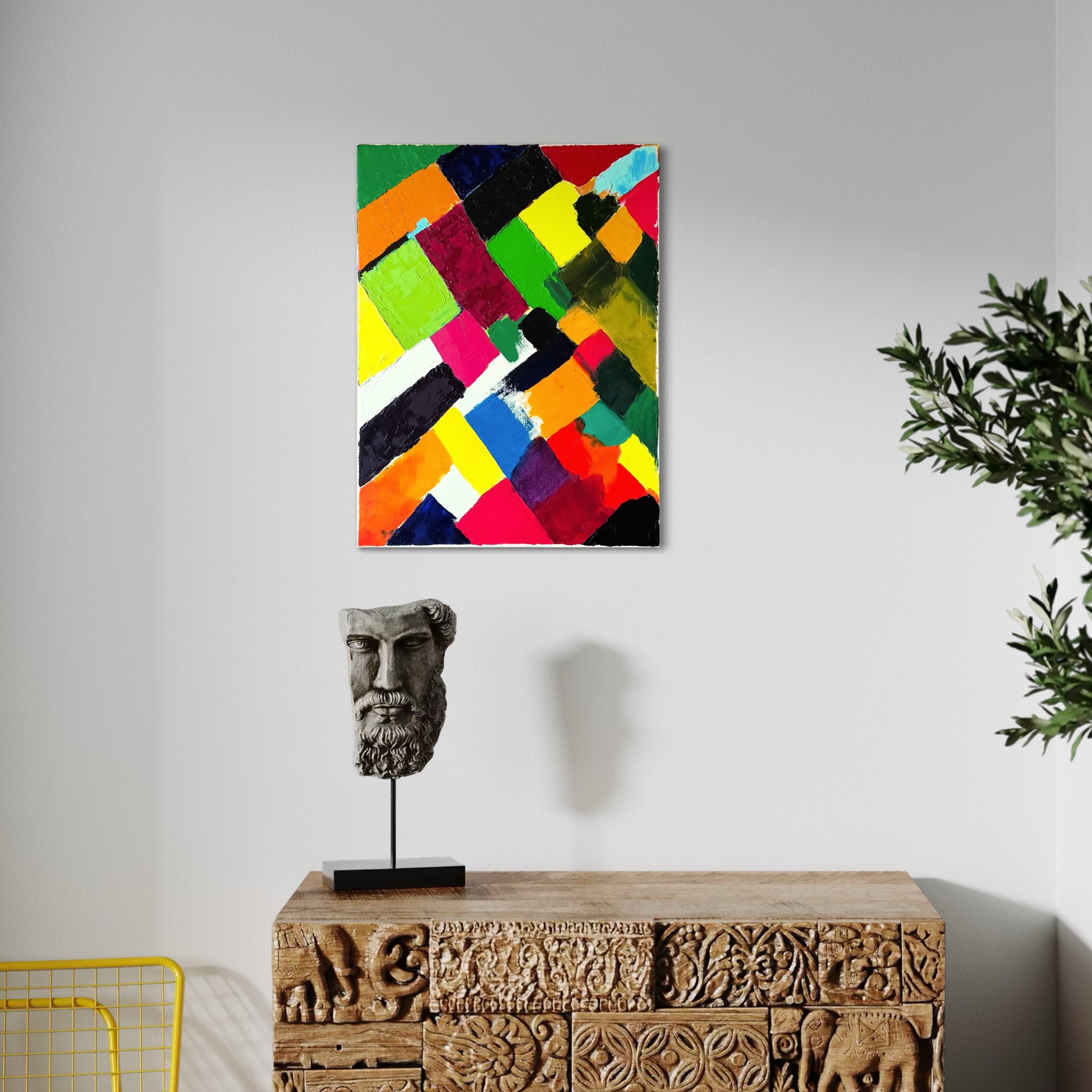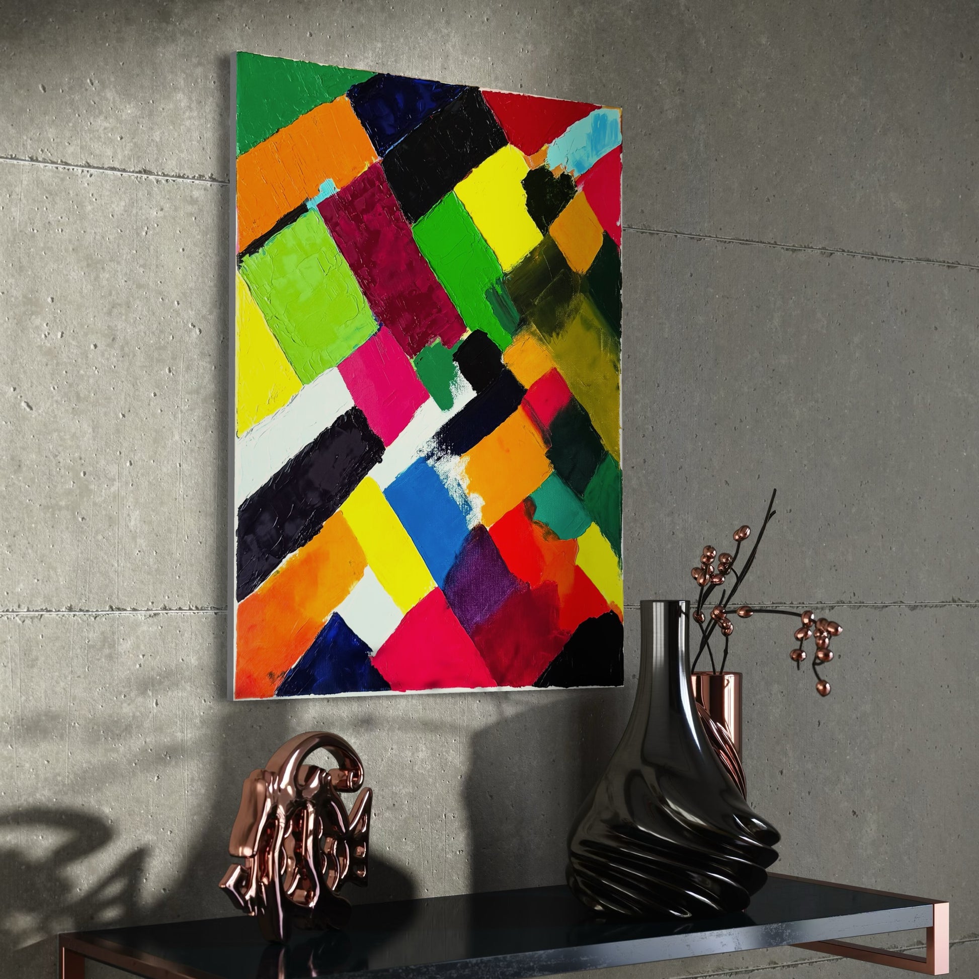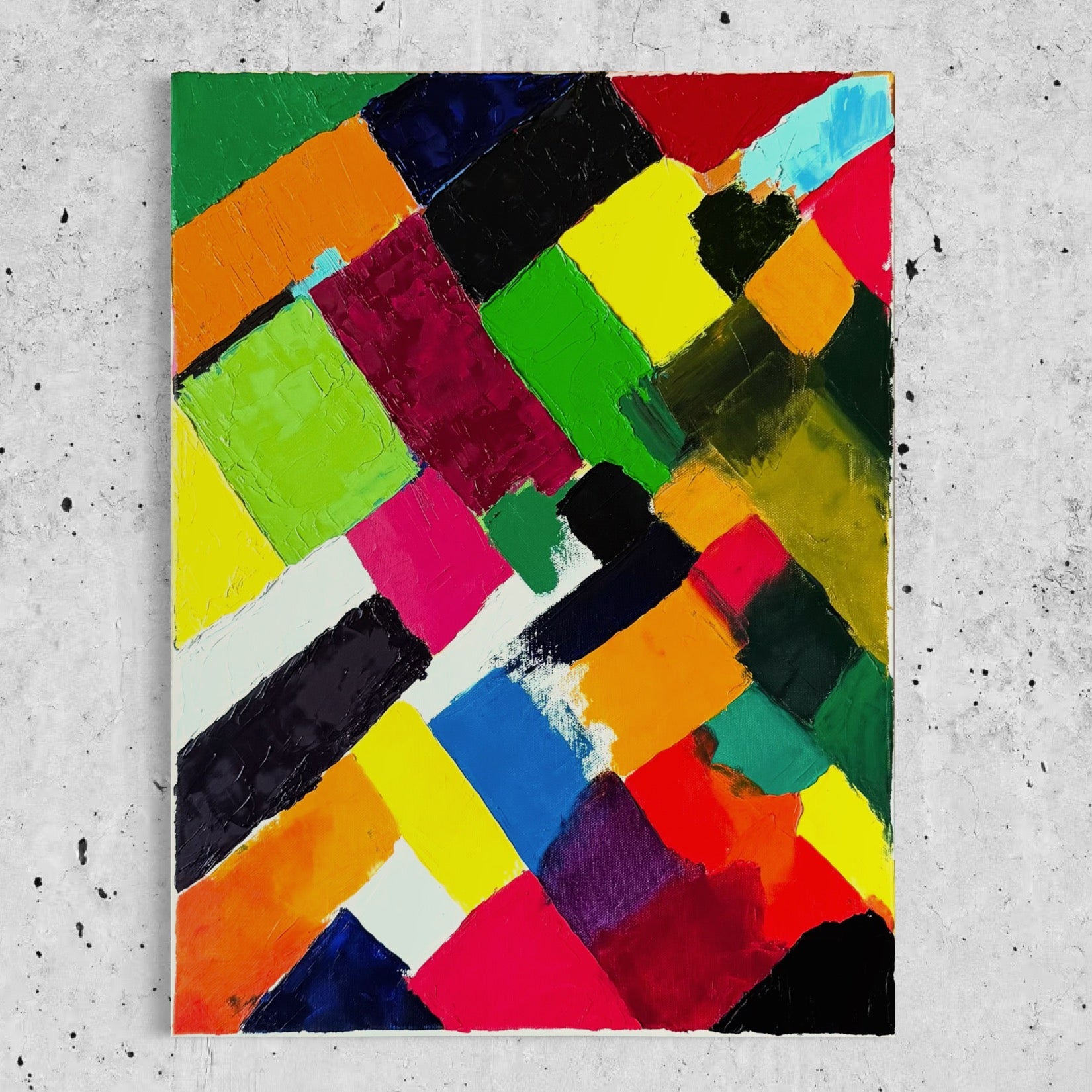 Patches is an exploration of rhythm and fragmentation, where bold squares of color intersect and collide in an energetic harmony. Through a painterly trick, some sections appear vividly wet while others feel dry, creating a dynamic contrast that heightens the energy of the piece. This illusion gives the work a shifting quality, as though the surface is still alive and in motion. The layered textures and saturated pigments invite the viewer to find balance within chaos, structure within spontaneity.